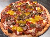 Pepperoni, sausage, jalapenos, banana peppers & crushed red peppers.